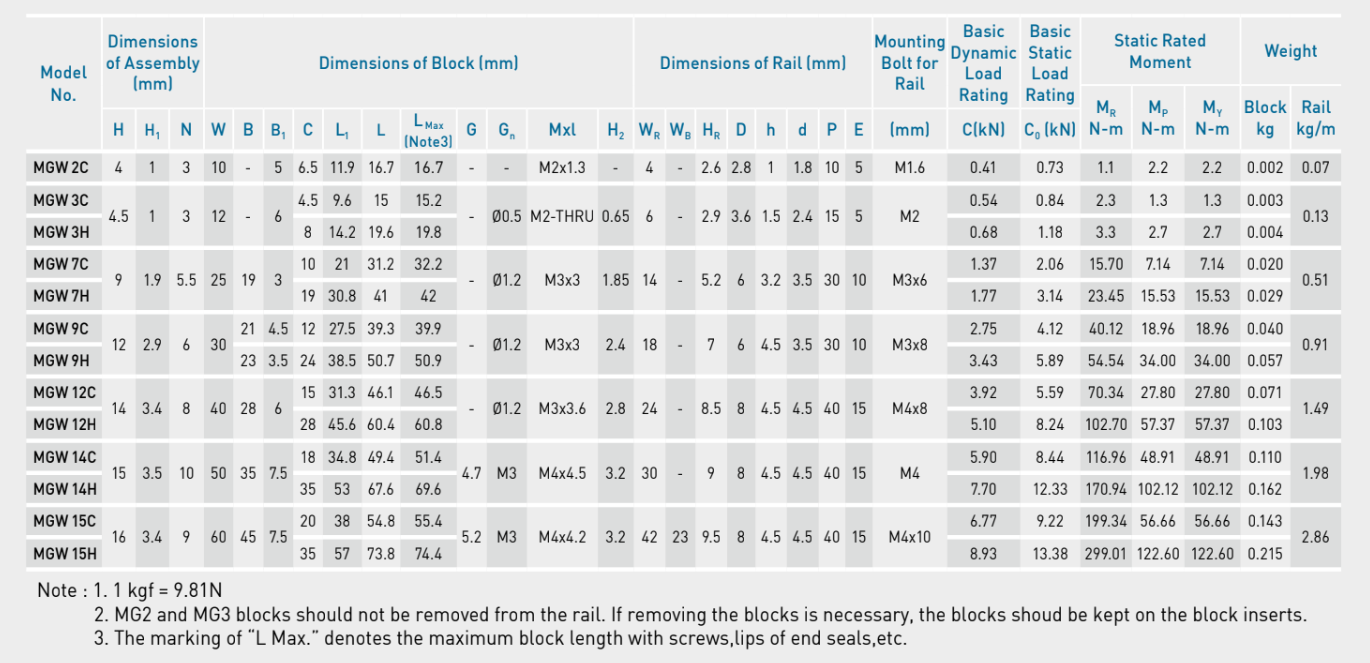 Con trượt MGW có thiết kế bản rộng, tối ưu cho các ứng dụng mini với hiệu suất cao. Dưới đây là thông số kỹ thuật tham khảo của MGW (xem chi tiết tại danh mục sản phẩm):