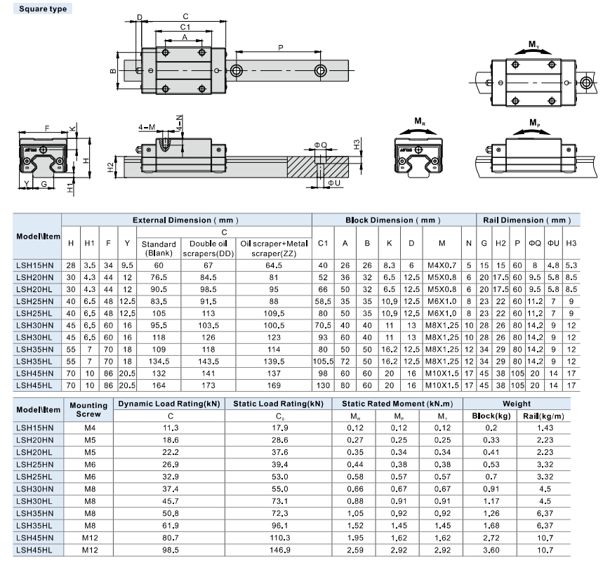 - Khả Năng Chịu Tải Vượt Trội: Thiết kế vuông với thép hợp kim cao cấp, LSH linear guide chịu tải trọng lớn, từ 5000N đến 45000N tùy model.